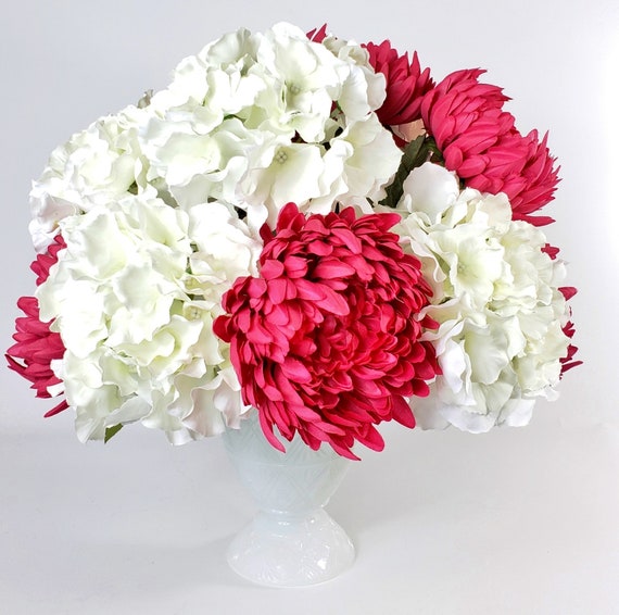 Silk Flower Arrangement White Hydrangea Fuchsia Football Mums Flowers For Her Centerpiece Flowers Silk Floral Home Decor Centerpiece